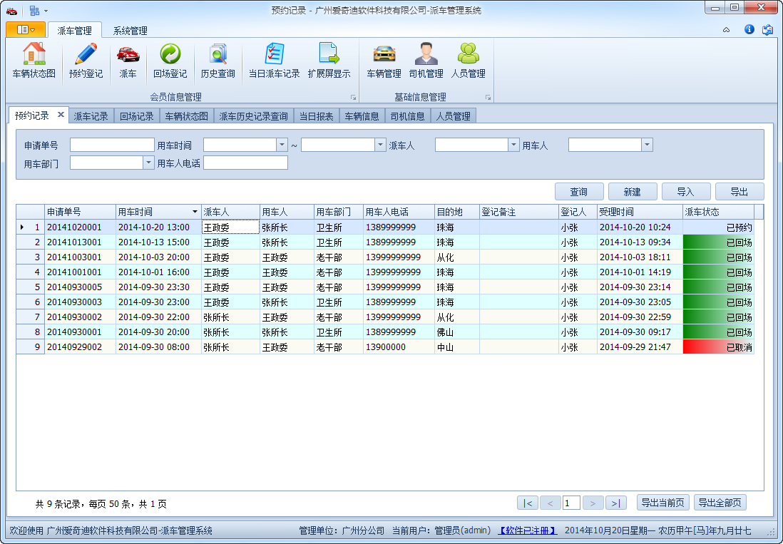 軟件包含預(yù)約、派車、回場(chǎng)等過(guò)程,綜合了對(duì)車輛、司機(jī)、使用人員、數(shù)據(jù)字典等綜合信息的管理,能夠方便實(shí)現(xiàn)車輛的派車調(diào)度處理,系統(tǒng)可以打印派車單、車輛統(tǒng)計(jì)等報(bào)表,以及支持把預(yù)約和派車信息顯示在幕墻或者擴(kuò)展屏幕上,非常方便操作和管理。