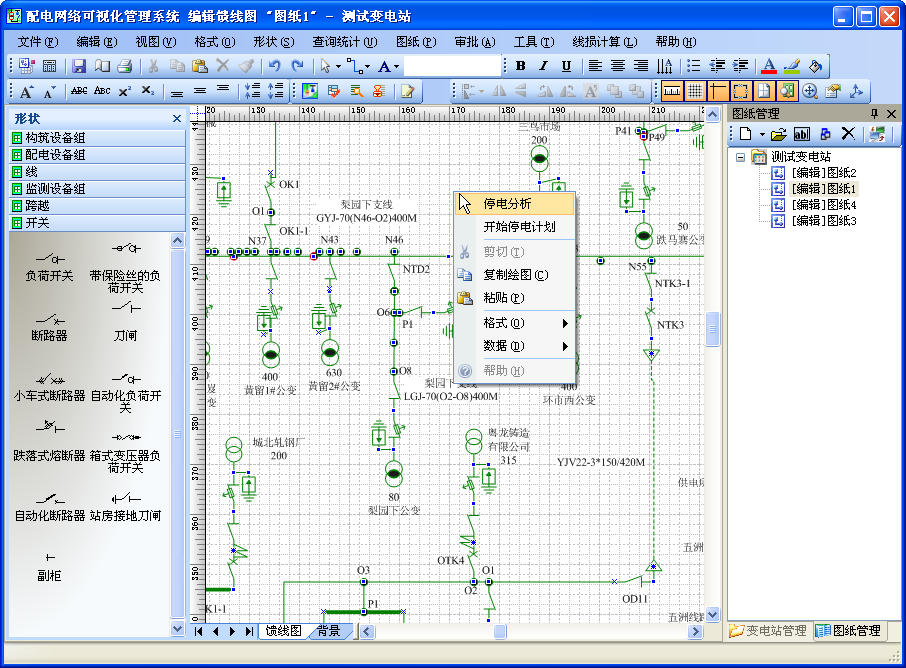 配電網(wǎng)絡(luò)管理可視化系統(tǒng),是按《電氣符號(hào)國(guó)家標(biāo)準(zhǔn)》提供統(tǒng)一的電網(wǎng)圖標(biāo)設(shè)計(jì),具有強(qiáng)大的繪圖功能、饋線圖管理功能、饋線圖的審批流程、在線修改饋線圖、實(shí)時(shí)查看饋線圖、設(shè)備與圖紙緊密結(jié)合、完整的資產(chǎn)管理與強(qiáng)大的資產(chǎn)信息查詢與統(tǒng)計(jì)功能、電力用戶信息管理、停電分析功能、線損計(jì)算功能等。
