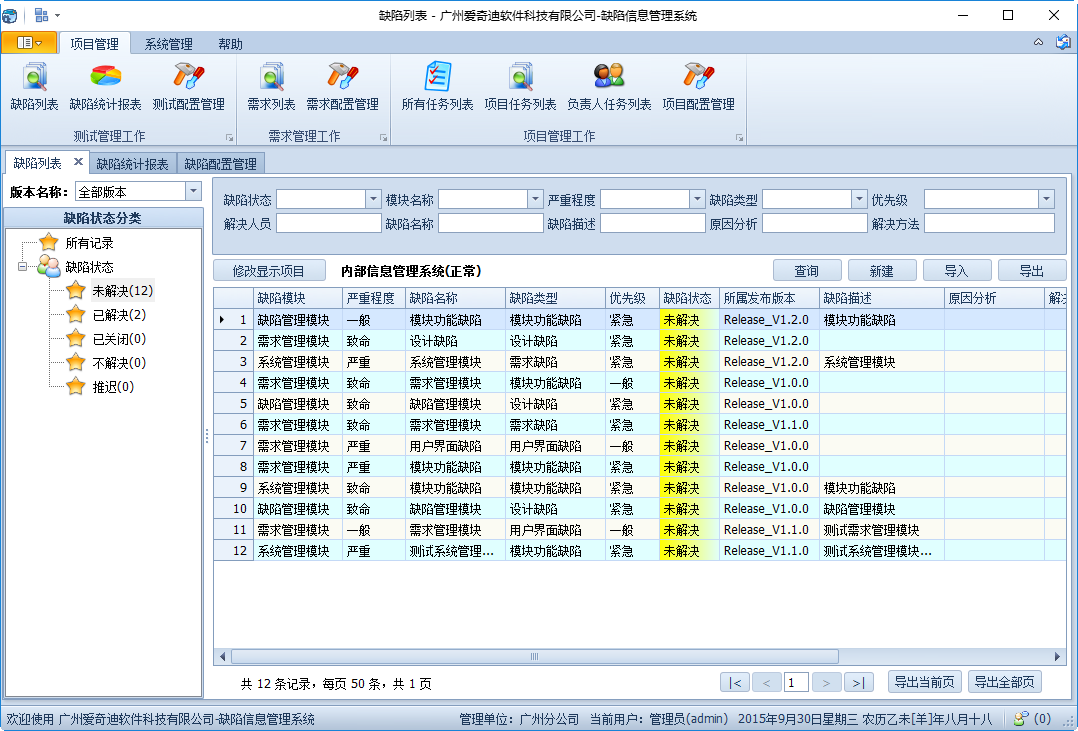 該軟件的功能包括:缺陷的維護(hù)管理(可上傳圖片)、項(xiàng)目列表維護(hù)、模塊列表維護(hù)、版本列表維護(hù)(數(shù)據(jù)字典維護(hù)(缺陷狀態(tài)、缺陷類型、緊急程度、優(yōu)先級(jí))、用戶及功能權(quán)限管理、機(jī)構(gòu)數(shù)據(jù)權(quán)限管理等功能。軟件能夠規(guī)范項(xiàng)目開(kāi)發(fā)過(guò)程中的缺陷記錄跟蹤流程、能夠根據(jù)不同的角色和機(jī)構(gòu)分配不同的缺陷,極大提高項(xiàng)目開(kāi)發(fā)及管理水平。軟件界面美觀大方,方便使用。